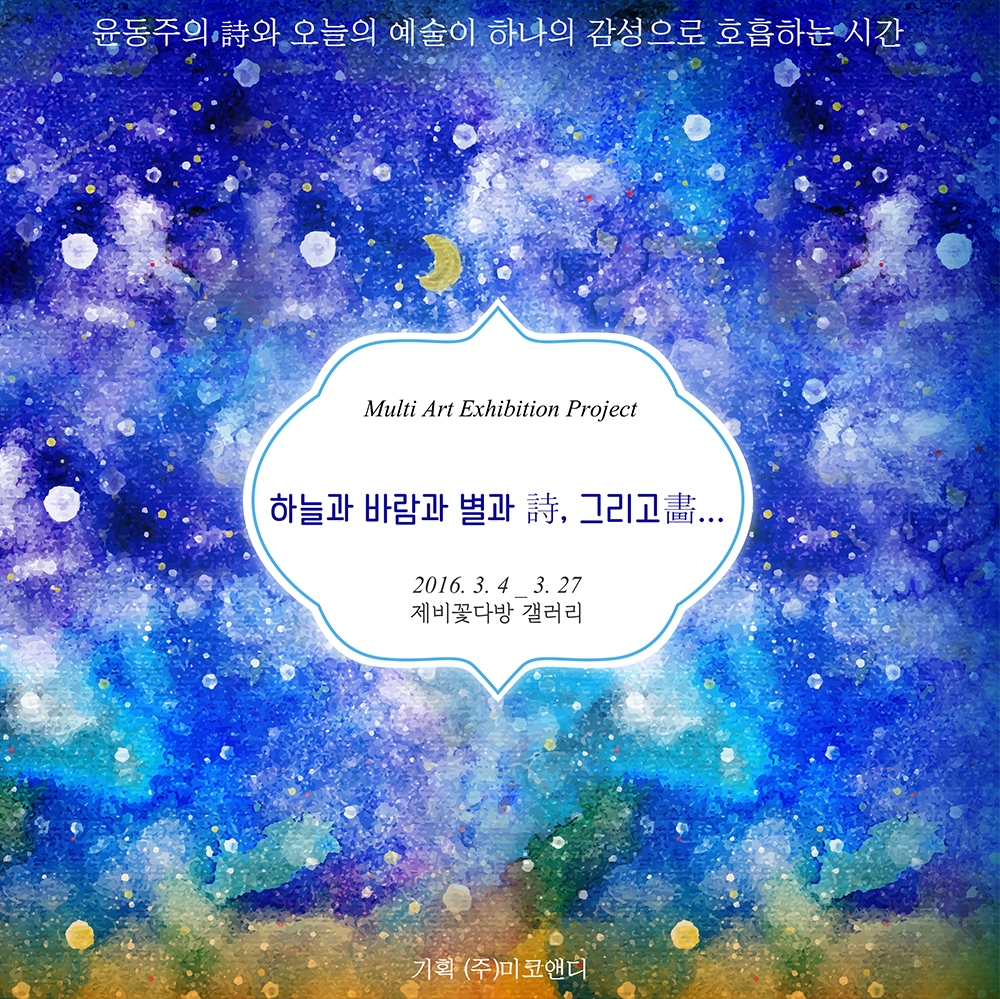 아트워크 큐레이션 전문기업 미코앤디는 3월 4일부터 27일까지 부암동 제비꽃다방 갤러리에서 시인 윤동주의 시와 그림, 낭송과 음악이 어우러진 멀티 아트 전시프로젝트 ‘하늘과 바람과 별과 詩, 그리고(畵) 展’을 펼친다.