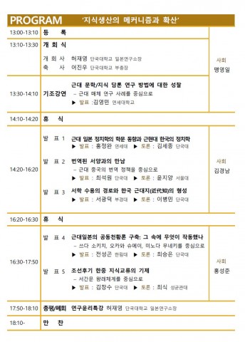 이를 통해 한·중·일의 지식 생산 과정을 밝히고, 생산된 지식이 어떠한 사회적 토대 위에서 전달되고, 확산해 나가는가에 대한 원리를 구명함으로써 지식 집단의 형성 토대를 확인할 수 있는 발표의 장이 되리라 기대된다.